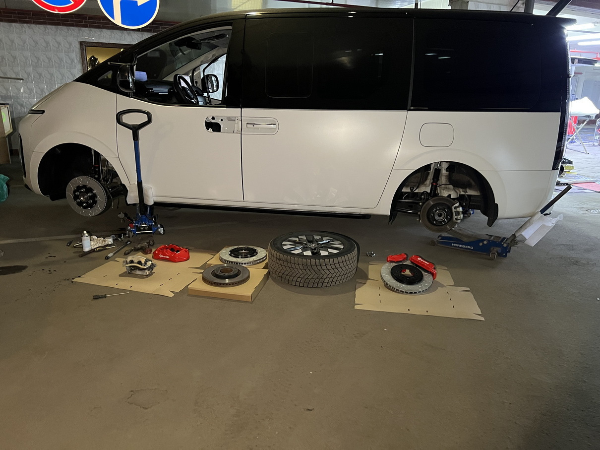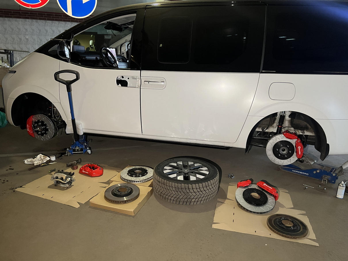 Мы устанавливаем проверенные комплекты усиленных тормозных систем (например, HP Brakes), которые по всем параметрам превосходят заводские. Они разработаны специально для тяжелых автомобилей и кардинально меняют поведение вашего Hyundai Staria на дороге.