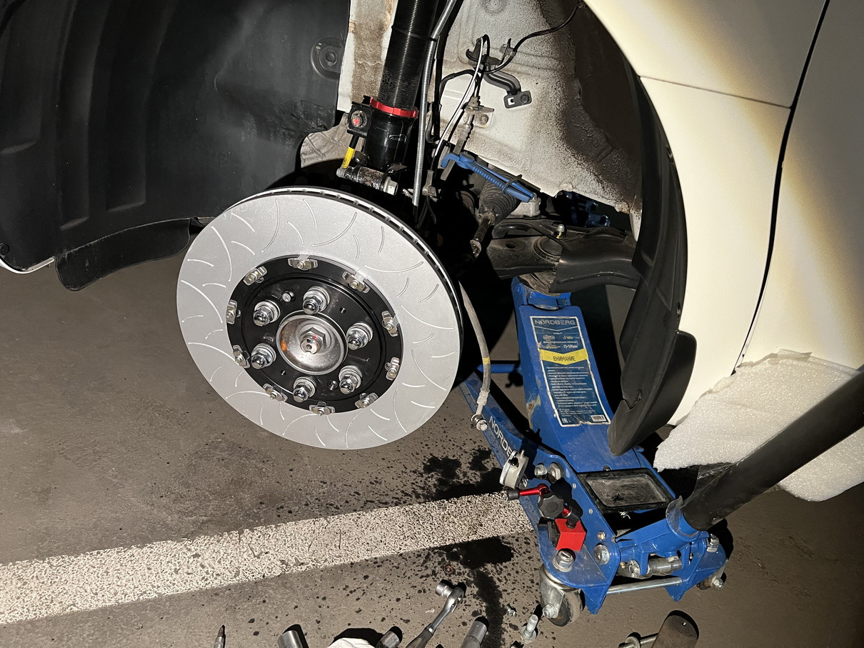 Вместо плавающего однопоршневого суппорта мы устанавливаем мощные 6- или 8-поршневые моноблочные суппорты. Они обеспечивают огромное, а главное — равномерное усилие прижима колодок к диску, делая торможение максимально эффективным.