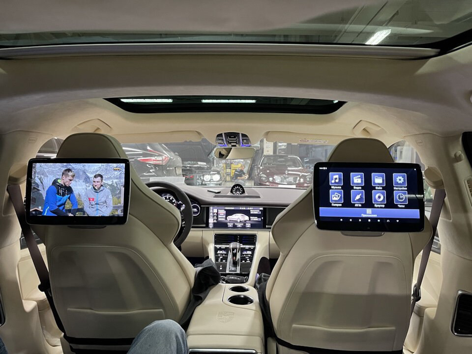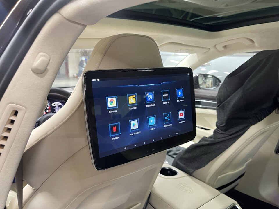 Мы используем оригинальные кронштейны от Mercedes, которые идеально вписываются в интерьер Porsche. Мониторы гармонично интегрируются в дизайн салона, не нарушая его эстетику. Это решение обеспечивает надежное крепление и удобный угол обзора для пассажиров.